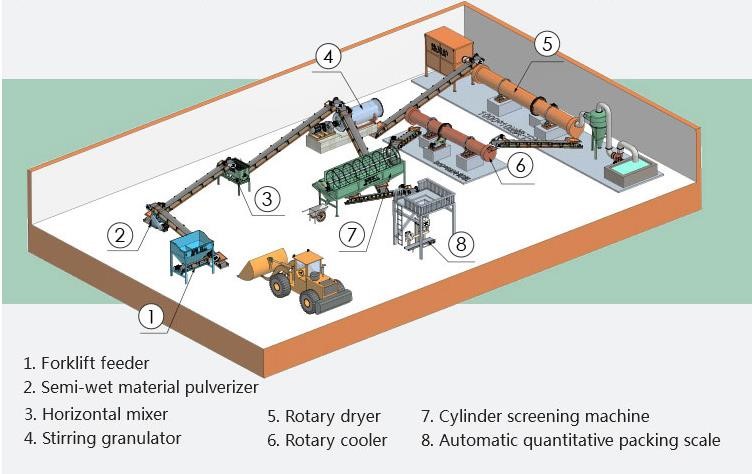 Raw material fermentation-Raw material crushing-Raw material mixing -Raw material drying-Fertilizer granulating -Fertilizer cooling-Fertilizer coating-Fertilizer packing
